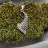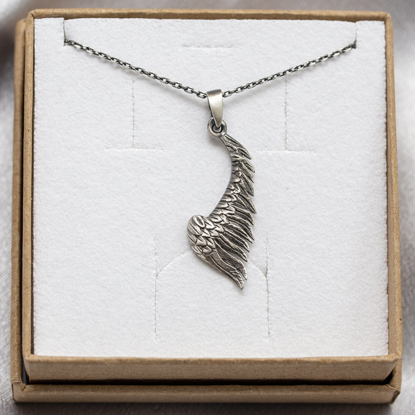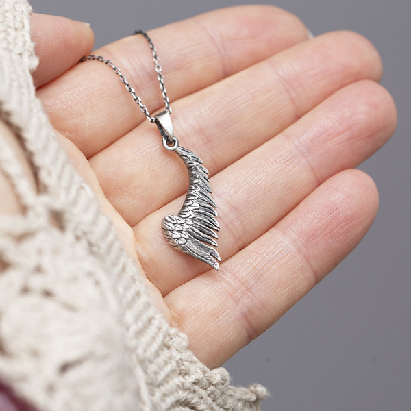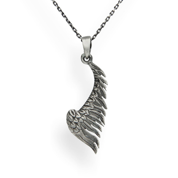 Piękna zawieszka w kształcie skrzydła. Całość wykonana ze srebra próby 925, ręcznie pokrytego oksydą. Wzór w modnym obecnie stylu vintage. Do kompletu można dokupić łańcuszek.