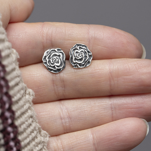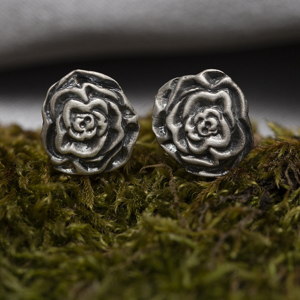 Przepiękne kolczyki srebrne w kształcie pięknych małych kwiatów róży. Każda różyczka została ręcznie zaoksydowana, dzięki czemu cały projekt uzyskał oryginalny charakter stylu Vintage. Śliczny wzór, ze względu na swoją delikatność będzie idealnym prezentem dla kobiety w każdym wieku.