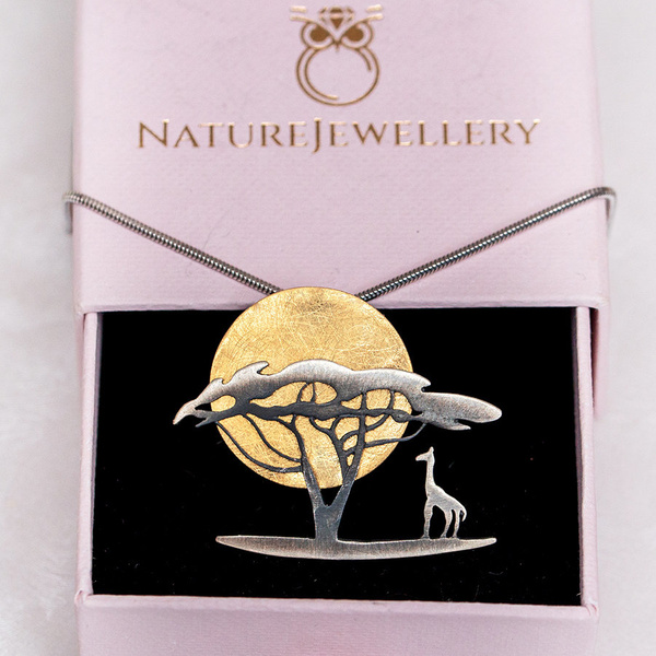Przepiękna i niezwykle oryginalna zawieszka srebrna przedstawiające krajobraz afrykańskiej sawanny. Cudowna, pozłocona kula zachodzącego słońca podkreśla tajemniczą aurę piękneJ żyrafy, stojącej pod drzewem akacji.