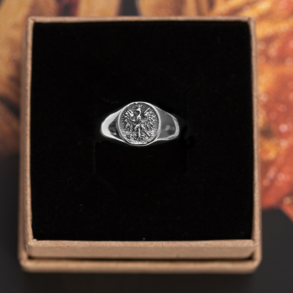 Rewelacyjny, patriotyczny sygnet męski z wizerunkiem Orła w koronie, wykonany ze srebra próby 925.