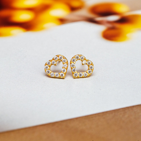 Piękne, eleganckie i uniwersalne kolczyki srebrne p. 925 pokryte złotem 24K w kształcie serduszek wysadzane wysokiej jakości cyrkoniami.