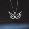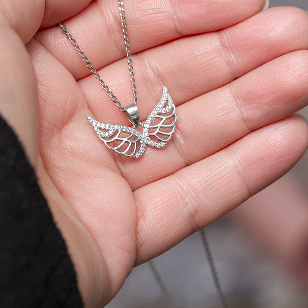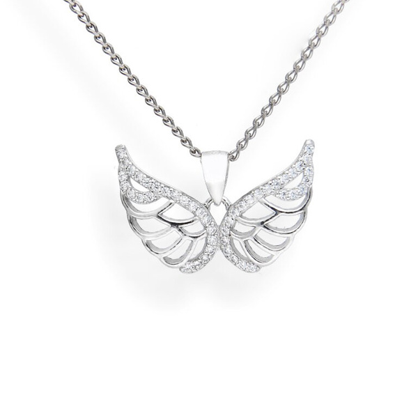 Zawieszka przedstawia ażurowe skrzydła, które są wysadzane drobniutkimi, intensywnie odbijającymi światło cyrkoniami.