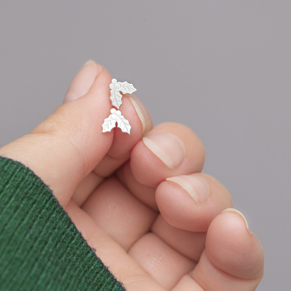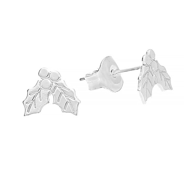 Piękne, klasyczne kolczyki srebrne, próby 925 w kształcie listków ostrokrzewu z owocami.