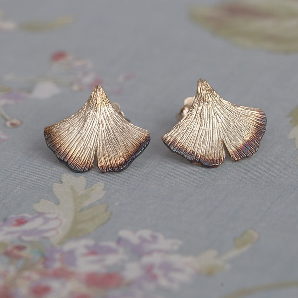 Satynowe kolczyki z listkami miłorzębu, zostały wykonane ze srebra p. 925 a wierzchu pokryte brązową oksydą.