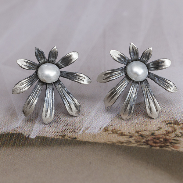 Kolczyki w kształcie dzwoneczków z naturalnymi perełkami. Zostały zaoksydowane, dzięki czemu cały wzór uzyskał unikatowy charakter stylu Vintage.