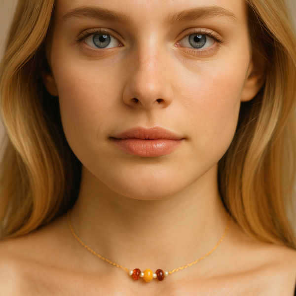 Naszyjnik z naturalnymi bursztynami i perłami, wykonany ze srebra próby 925 i pozłocony złotem 24K.