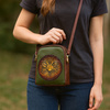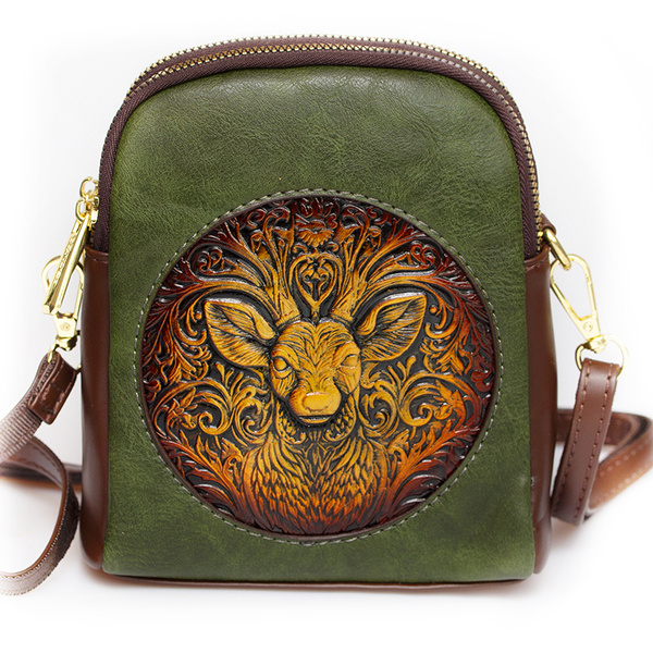 Śliczna, mała torebka z wytłoczonym wzorem przedstawiającym jelenia.
