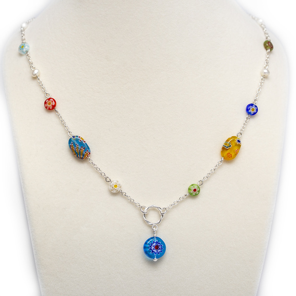 Naszyjnik został wykonany ze srebra p.925, naturalnych pereł i szkła Murano z zastosowaniem techniki millefiori.