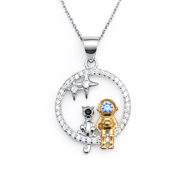 Wisiorek jest wysadzany cyrkoniami bezbarwnymi, jedną niebieską (kosmonauta) i czarną (kot).