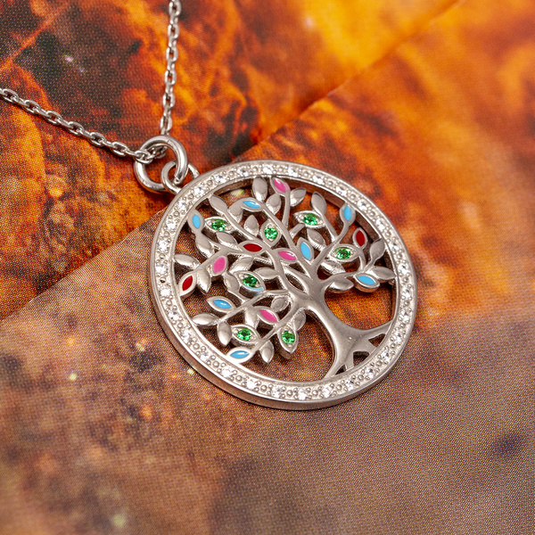 Urocze drzewko jest wysadzane zielonymi i bezbarwnymi cyrkoniami, niektóre listki zostały pokryte emalią w kolorze błękitnym i różowym.