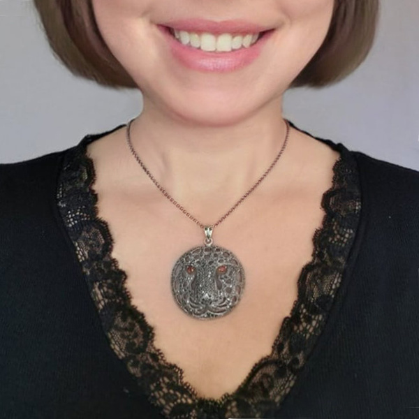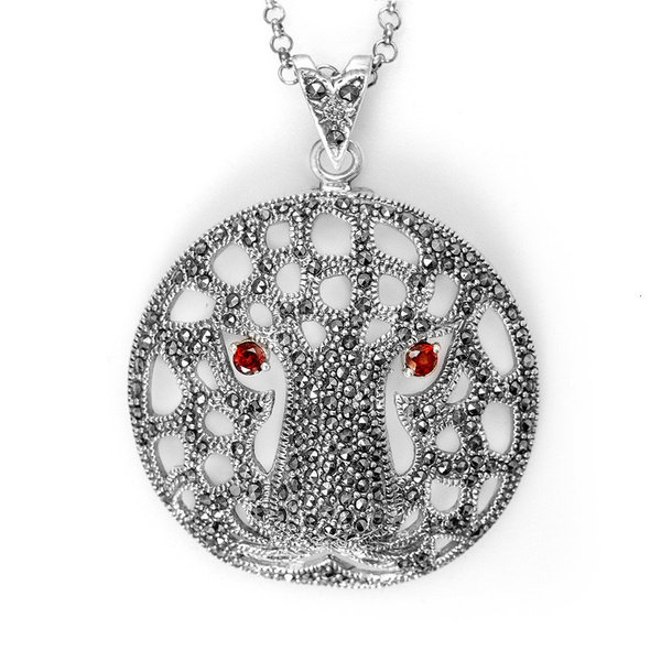 Cudna, przepięknie się mieniąca, srebrna zawieszka wysadzana markazytami i granatami w kształcie głowy tygrysa.