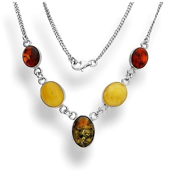 Wyjątkowej urody naszyjnik z wielokolorowymi, naturalnymi bursztynami oprawionymi w srebro p.925.